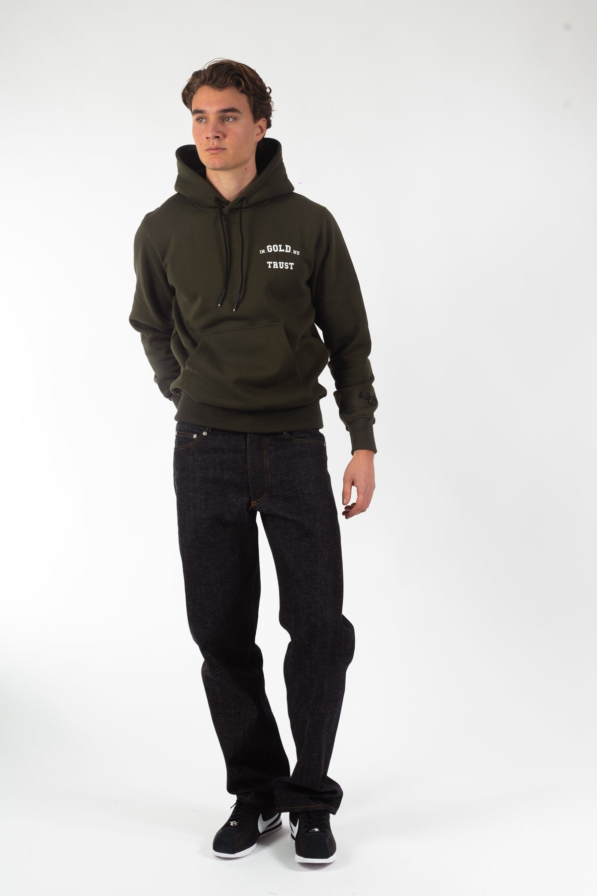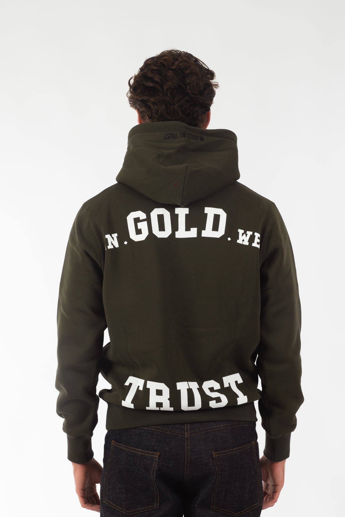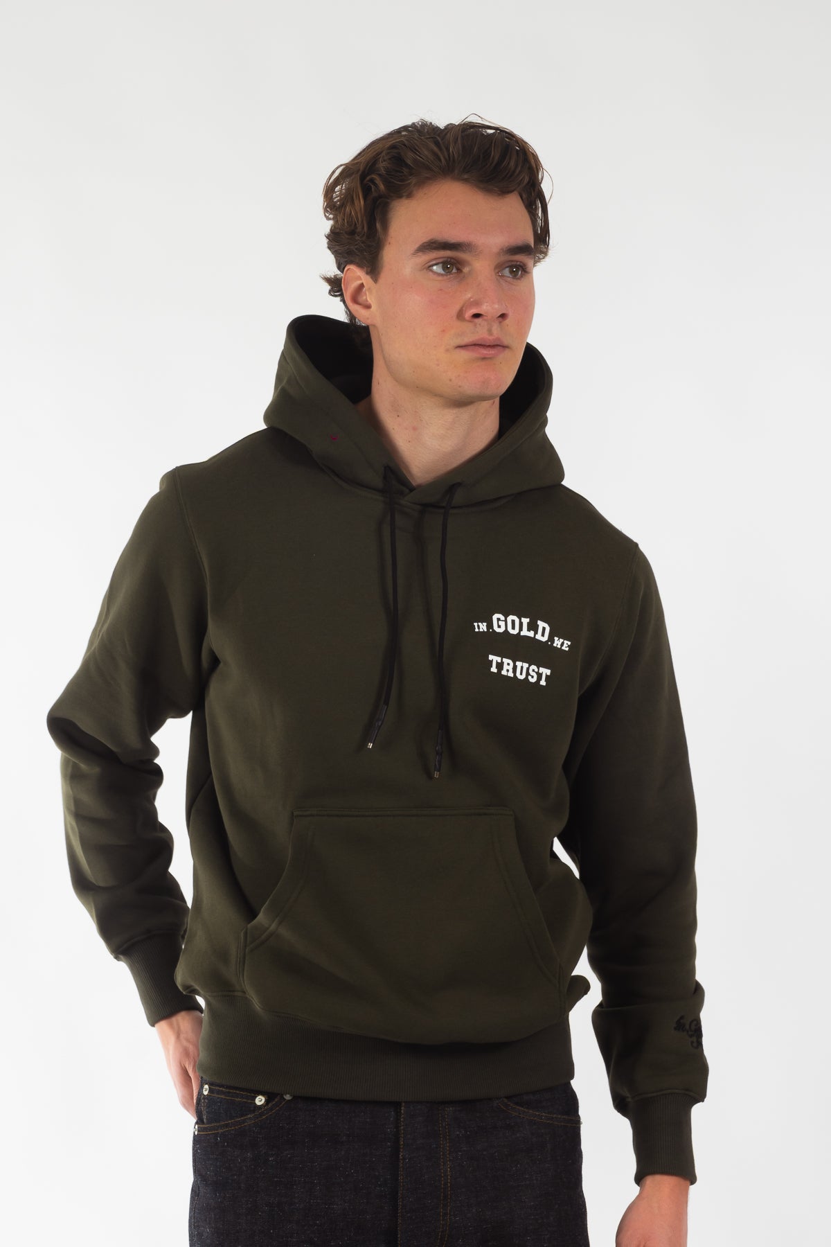 Hoodie uit de nieuwe collectie, gebaseerd op ons herkenbare model en uitgevoerd in donkergroen. Gemaakt van een comfortabele polyester-katoen mix die zorgt voor een zachte feel en een vormvaste pasvorm. Afgewerkt met subtiele branding en verfijnde details voor een tijdloze uitstraling. Een veelzijdige essential voor dagelijks gebruik, uitgevoerd in de originele kwaliteit waar In Gold We Trust om bekendstaat.